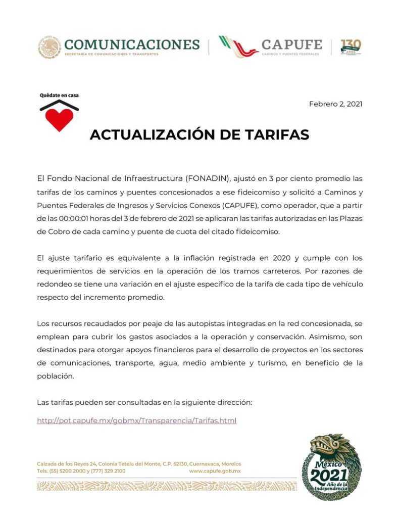 Se autorizó Incremento de 3 por ciento a las tarifas de peaje en autopistas concesionadas a Caminos y Puentes Federales de Ingresos y Servicios Conexos (Capufe) a partir del 3 de febrero, informó el Fondo Nacional de Infraestructura (Fonadin).