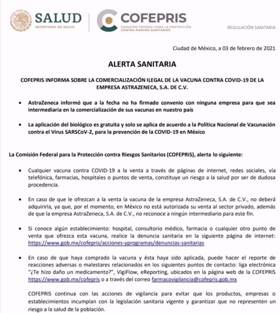 La COFEPRIS advirtió que cualquier vacuna contra COVID-19 a la venta a través de páginas de internet, redes sociales, vía telefónica, farmacias, hospitales o puntos de venta, constituye un riesgo a la salud por ser de dudosa procedencia.