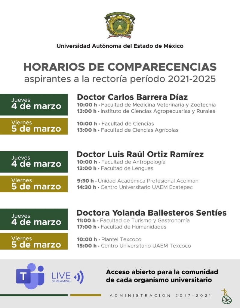 Carlos Barrera Díaz, Luis Raúl Ortiz Ramírez y Yolanda Ballesteros Sentíes, aspirantes a la rectoría de la Universidad Autónoma del Estado de México (UAEM), inician el jueves 4 de marzo sus comparecencias digitales ante la comunidad de los diferentes organismos universitarios, a través de transmisión en vivo por Microsoft Teams Live.