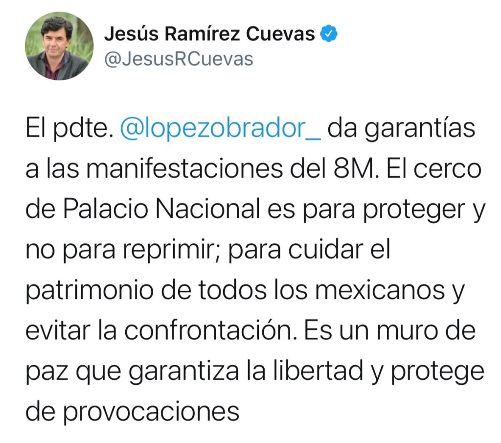 Ante las muestras de repudio a la decisión del Presidente Andrés Manuel López Obrador de proteger con un muro los edificios públicos, en lugar de proteger la vida y la integridad física de las mujeres mexicanas, Jesús Ramírez Cuevas, vocero presidencial, se alcanzó la ocurrencia de decir que “es un muro de paz”.