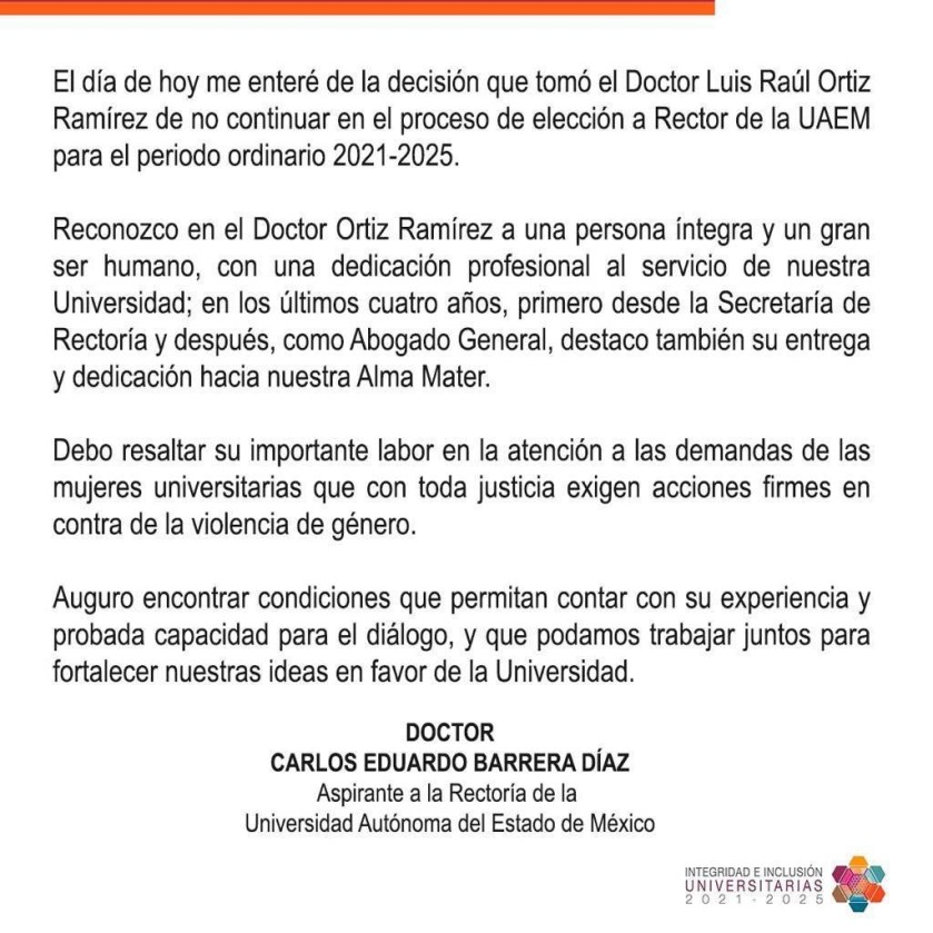 EL Aspirante a la Rectoría de la Universidad Autónoma del Estado de México, Carlos Eduardo Barrera Díaz, reconoció probada experiencia y capacidad en el Doctor Luis Raúl Ortiz Ramírez, quien tomó la decisión de no continuar en el actual Proceso de Elección a Rector.