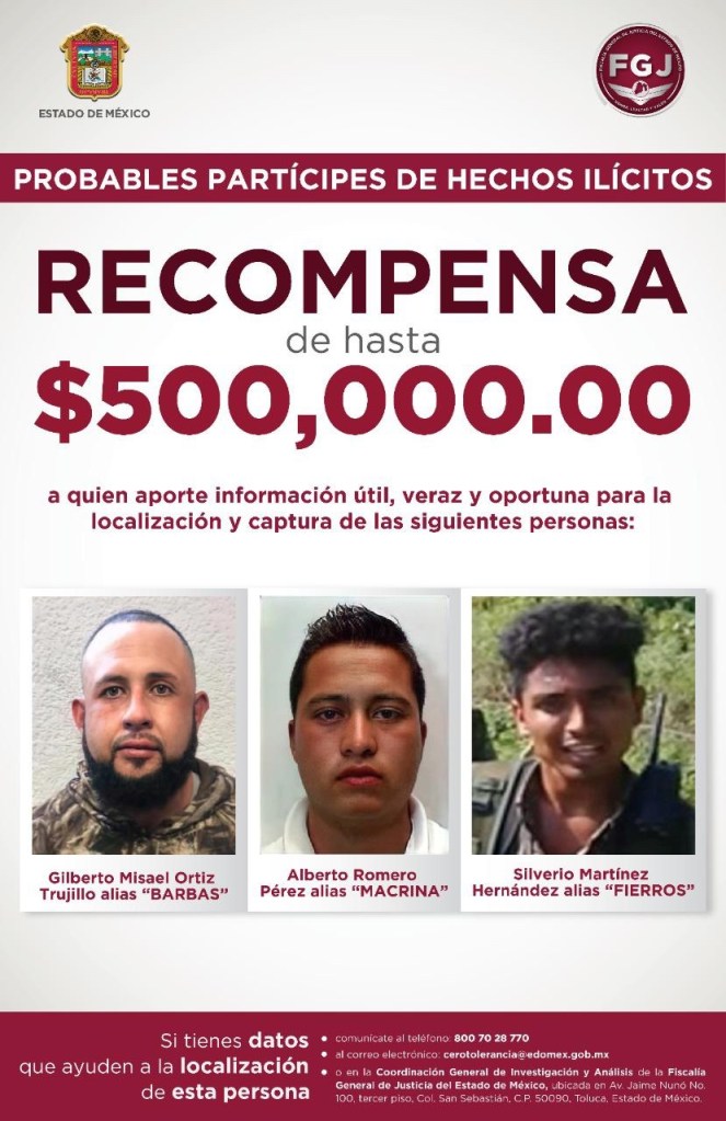 Mediante el acuerdo 07/2021, signado por el Fiscal General, Alejandro Gómez Sánchez, la FGJEM autorizó la entrega de una recompensa de hasta 500 mil pesos para localizar y detener a Alberto Romero Pérez, alias “Macrina”; Silverio Martínez Hernández “Fierros” y Gilberto Misael Ortiz Trujillo “Barbas”.