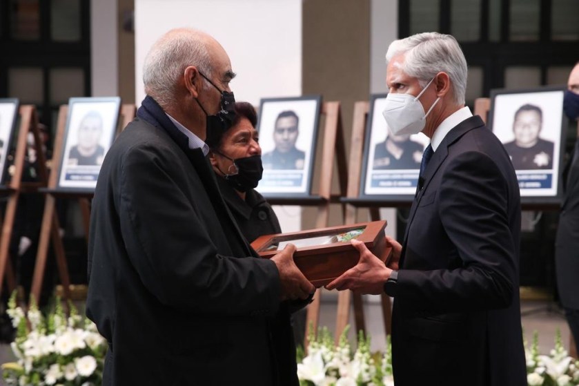 El Gobernador Alfredo Del Mazo entregó a los familiares de los elementos caídos reconocimientos post mortem, a quienes les expresó su más sentido pésame y agradecimiento por la labor que los policías llevaron a cabo con entrega y compromiso con la sociedad, anteponiendo su vida por el bienestar de los mexiquenses.