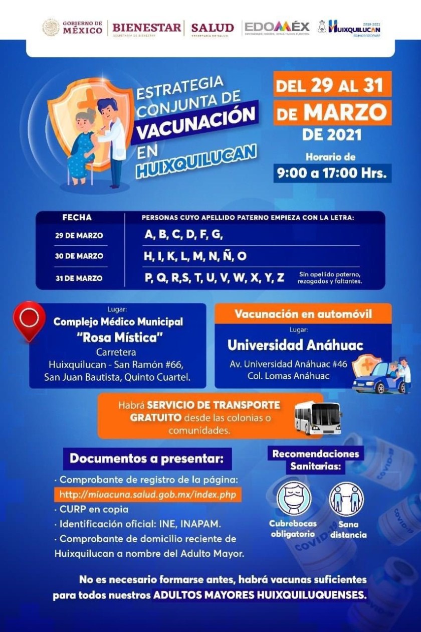 El Ayuntamiento de Huixquilucan reporta lista la logística para la jornada de vacunación de adultos mayores, misma que se realizará del 29 al 31 de marzo de 2021.