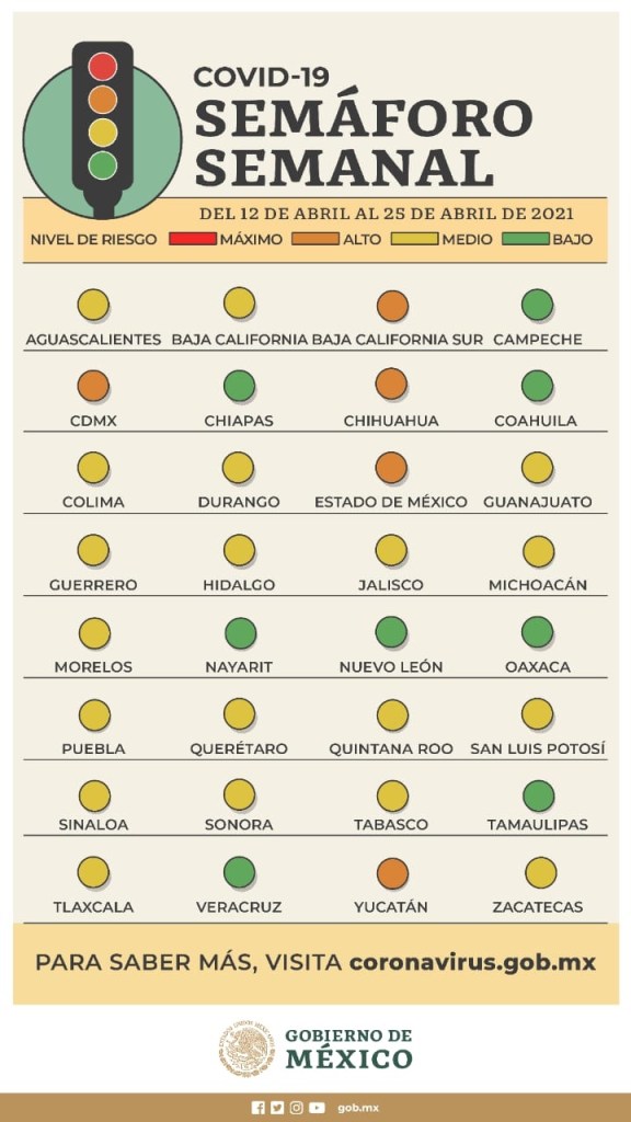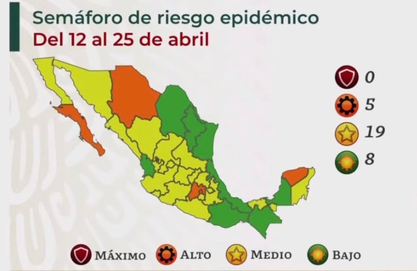 El semáforo epidemiológico de la República Mexicana indica, según el Gobierno de México, que ninguna entidad estará en color rojo, pero 5 se mantienen en naranja, durante el periodo del lunes 12 al 25 de abril de 2021.