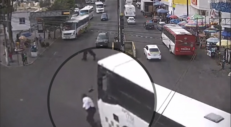 Una de las cámaras del sistema de seguridad, en las inmediaciones de la central camionera de Toluca, captó las impresionantes imágenes del momento en que el camión impacta de lleno al uniformado, quien se impacta en el suelo, con varias lesiones que ponen en peligro su vida.