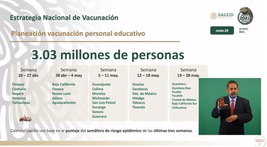El Gobierno de México presentó la programación de la primera etapa de vacunación a maestras, maestros y demás personal educativo.