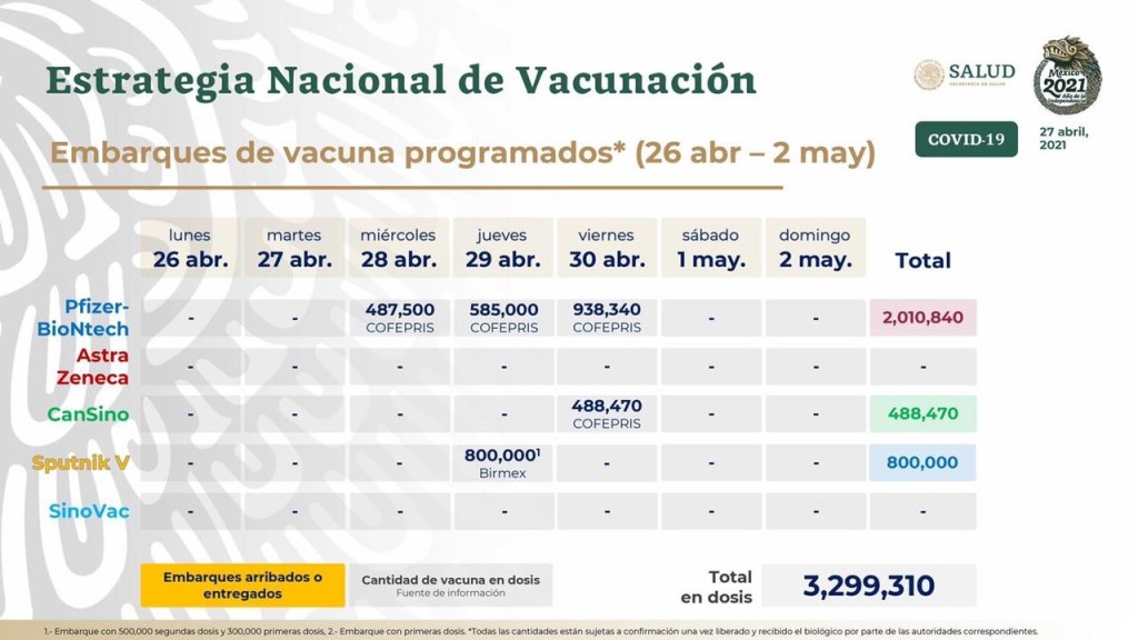 Esta semana, se tendrá el embarque más grande de Pfizer hasta ahora: 2 millones 010 mil 840 dosis.