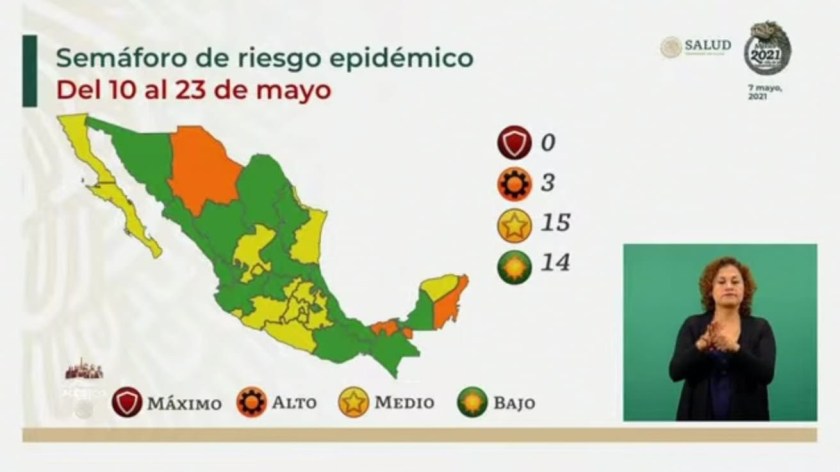 La Secretaría de Salud, dependiente del Gobierno de México, informó que el semáforo de riesgo epidemiológico contempla solamente tres entidades federativas en color naranja, es decir, Chihuahua y Quintana Roo, mientras que 15 están en color amarillo y 14 en verde.