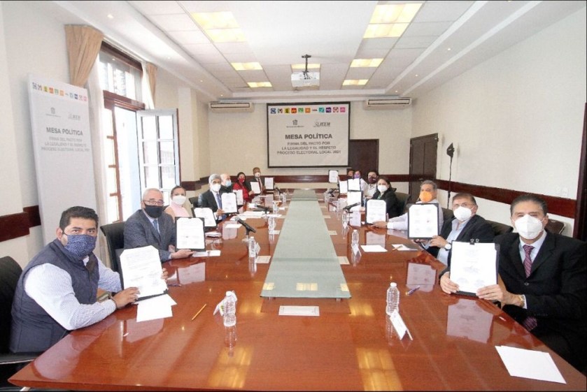Toluca, Estado de México.- Durante la cuarta sesión de la Mesa Política, las y los dirigentes de los 11 partidos políticos que participan en el proceso electoral local 2021, firmaron el Pacto por la Legalidad y el Respeto, siendo testigos de honor de este acuerdo, el gobierno de la entidad, a través de la Secretaría General de Gobierno y autoridades del Instituto Electoral del Estado de México (IEEM).
