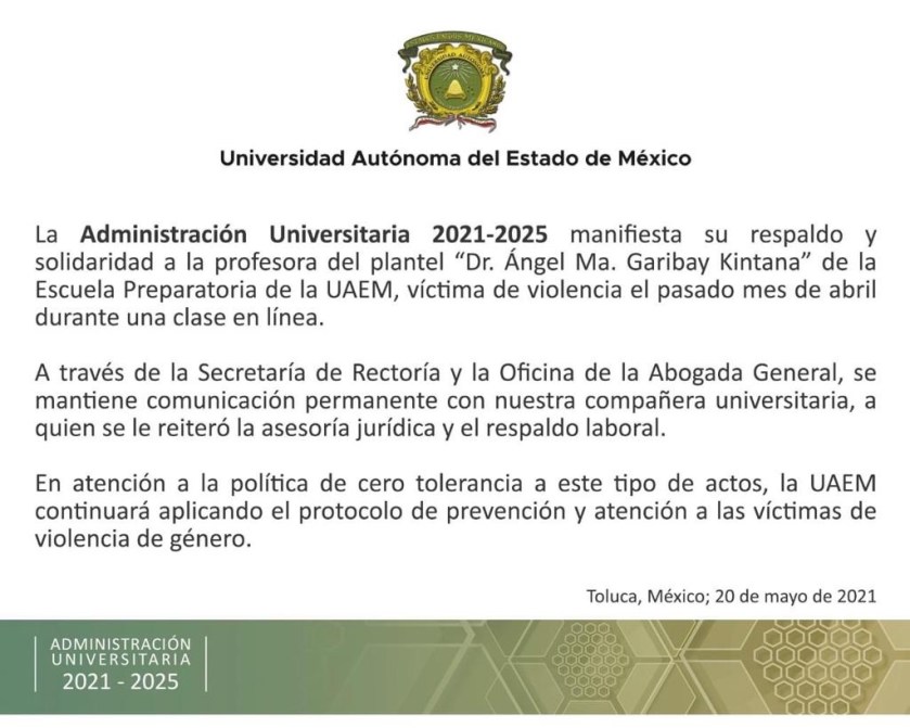La Administración Universitaria 2021-2025 manifiesta su respaldo y solidaridad a la profesora del plantel “Dr. Ángel Ma. Garibay Kintana” de la Escuela Preparatoria de la UAEM, víctima de violencia el pasado mes de abril durante una clase en línea, señala el documento.