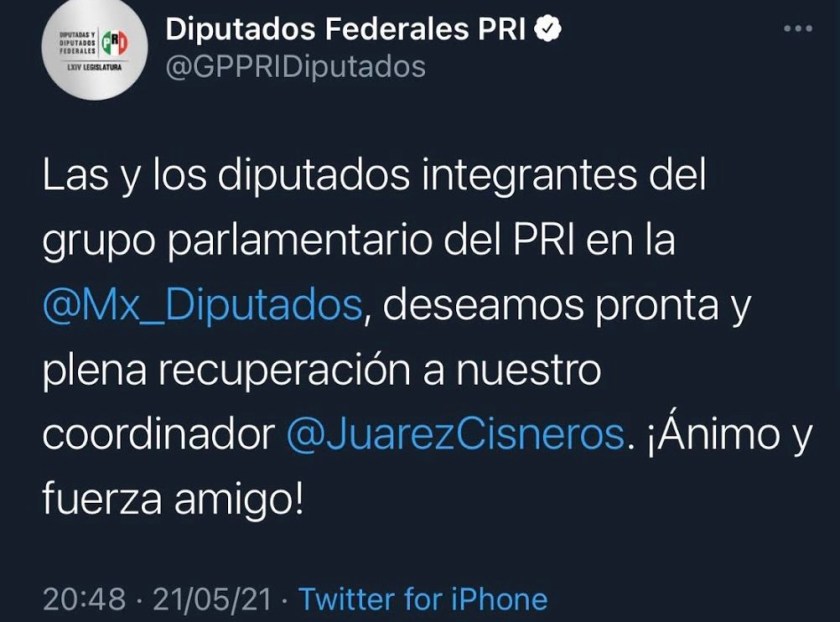 Al respecto, el excandidato presidencial del PRI, José Antonio Meade, expresó sus deseos de que mejore vía Twitter: “le deseo a Juárez Cisneros mucha fortaleza para recuperar su salud. Lo tendremos a él y a su familia en nuestras oraciones. Tengo fe en su pronta y plena recuperación”.