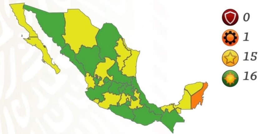Por su parte, otros 15 Estados estarán en color amarillo y solamente una entidad, Quintana Roo, se ubica en color naranja, nivel de riesgo alto dentro de la pandemia por COVID-19.