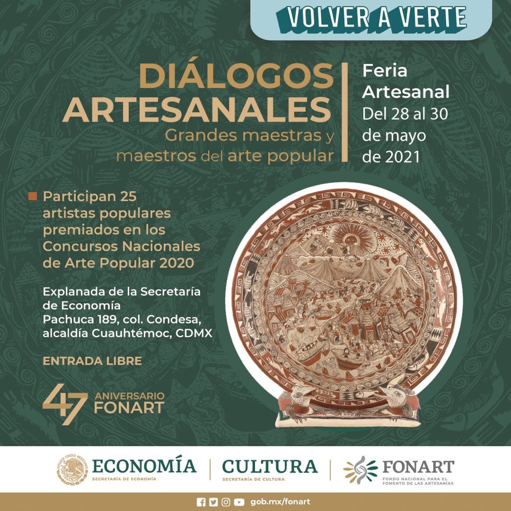 La Feria “Diálogos Artesanales, Grandes maestras y maestros del arte popular” se puede visitar del 28 al 30 de mayo, en la explanada de la Secretaría de Economía (Pachuca 189, col. Condesa), de 10:00 a 18:00 horas. Para el acceso es obligatorio el uso de cubrebocas y pasar el filtro sanitario instalado en la entrada, así como respetar la sana distancia, entre otras medidas para el cuidado de la salud ante la COVID-19.