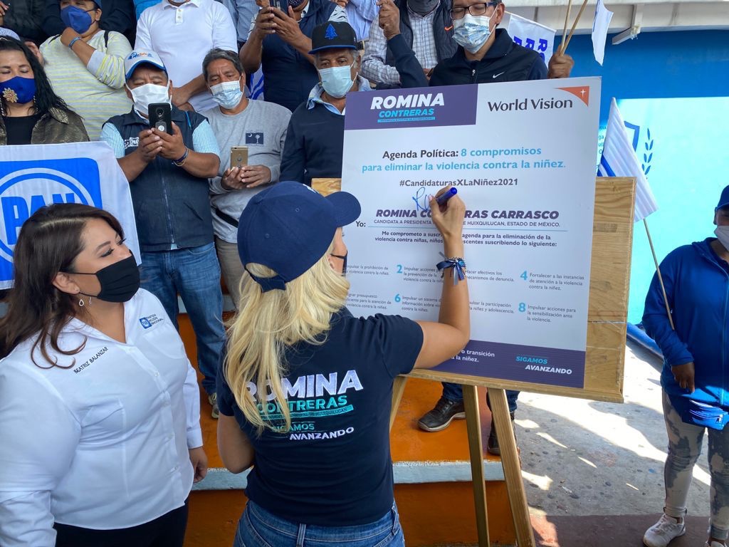 Huixquilucan, Estado de México, 27 de mayo de 2021.- La candidata del Partido Acción Nacional (PAN) a la presidencia municipal de Huixquilucan, Romina Contreras Carrasco, firmó los ocho compromisos para eliminar la violencia contra la niñez, que promueve la organización World Vision, a través de los cuales se comprometió a impulsar una agenda política con acciones para prevenir el maltrato de los menores de edad y hacer efectivos los mecanismos de denuncia, en caso de que se presente un caso de este tipo en la demarcación, además de asignar presupuesto para la atención de quienes son víctimas.
