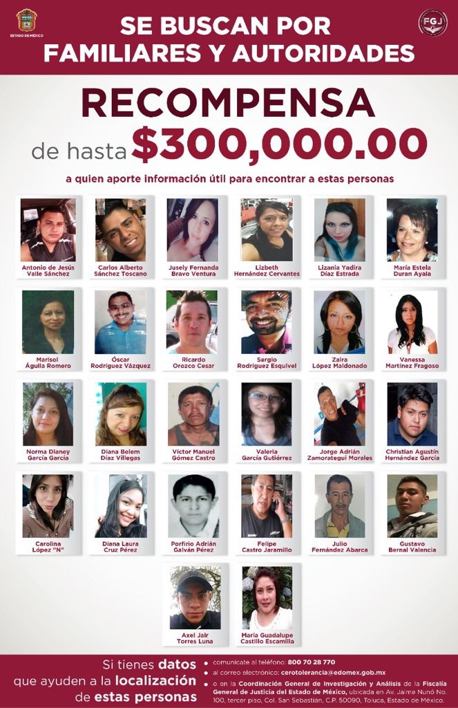 Toluca, Estado de México, 1 de junio de 2021.- La Fiscalía General de Justicia del Estado de México (FGJEM) autorizó el ofrecimiento de una recompensa de hasta 300 mil pesos, a quien o quienes aporten información útil, veraz y oportuna relacionada con la investigación que realiza esta Institución para la localización de 26 personas desaparecidas o no localizadas y para la búsqueda, ubicación y obtención de información que permita conocer la identidad, localización y captura de los probables responsables de su desaparición, así como para la localización y aprehensión de ocho probables autores o partícipes de diversos hechos delictivos.