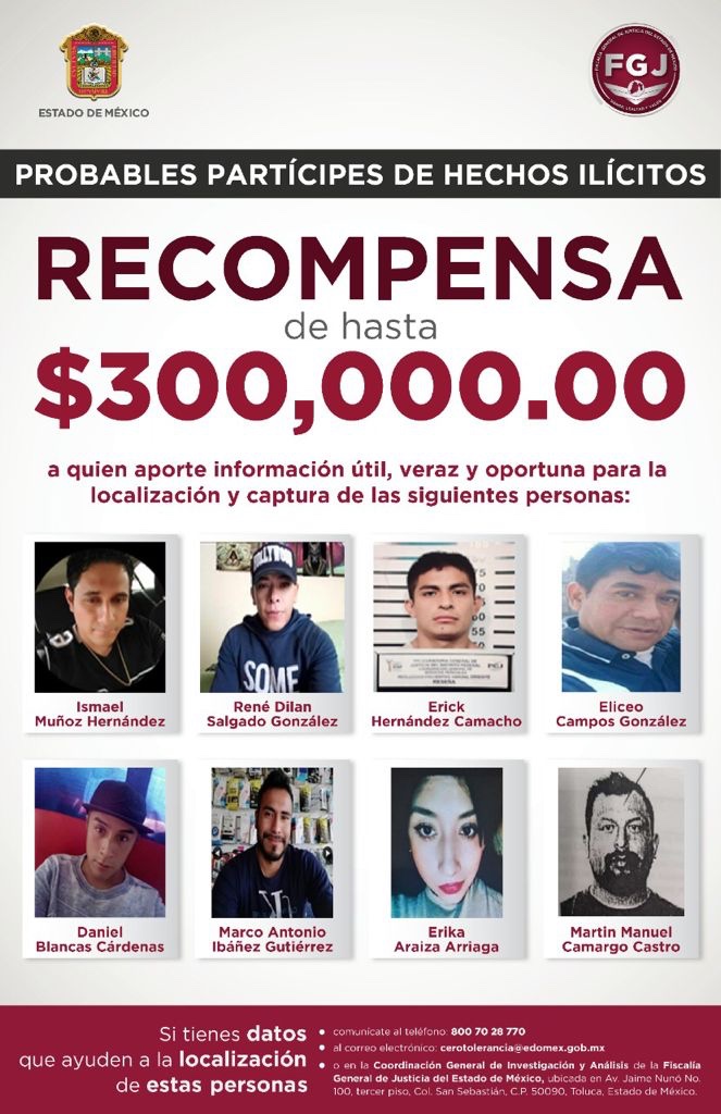 Además, la FGJEM también ofrece recompensas de hasta 300 mil pesos para la localización y aprehensión de Ismael Muñoz Hernández, René Dilan Salgado González, Erick Hernández Camacho, Eliceo Campos González, Daniel Blancas Cárdenas, Marco Antonio Ibáñez Gutiérrez, Erika Araiza Arriaga y Martin Manuel Camargo Castro.