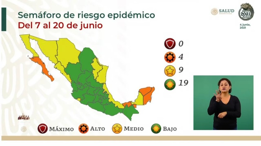 En la actualización del semáforo por COVID-19, en el país hay 19 estados en color verde, 9 en amarillo y 4 en color naranja.
