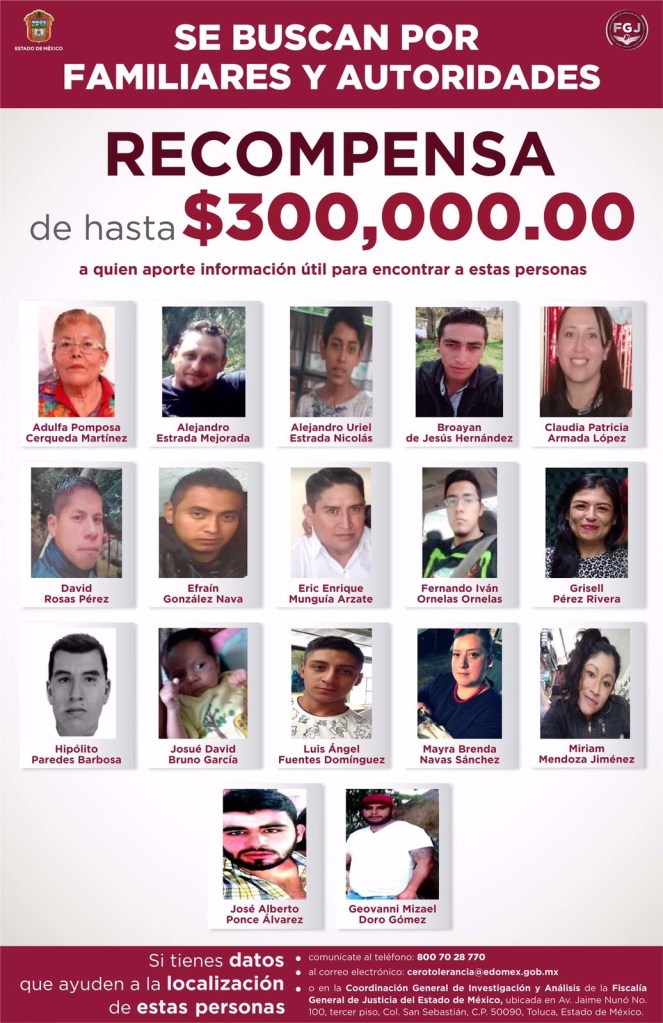 Toluca, Estado de México, 11 de junio de 2021.- La Fiscalía General de Justicia del Estado de México (FGJEM) autorizó el ofrecimiento de una recompensa de hasta 300 mil pesos, a quien o quienes aporten información útil, veraz y oportuna relacionada con la investigación que realiza esta Institución para la localización de 17 personas desaparecidas o no localizadas y para la búsqueda, ubicación y obtención de información que permita conocer la identidad, localización y captura de los probables responsables de su desaparición.