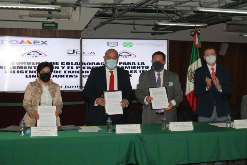 Ciudad de México, 13 de junio de 2021.- Los presidentes de las Juntas Locales de Conciliación y Arbitraje de la Ciudad de México, Víctor Martínez Corona, y del Estado de México, del Valle de Toluca, Sara Dávila Sánchez, y del Valle Cuautitlán-Texcoco, Jesús Farías Muñoz, suscribieron un convenio de colaboración para la implementación y perfeccionamiento de las diligencias de exhortos digitales.