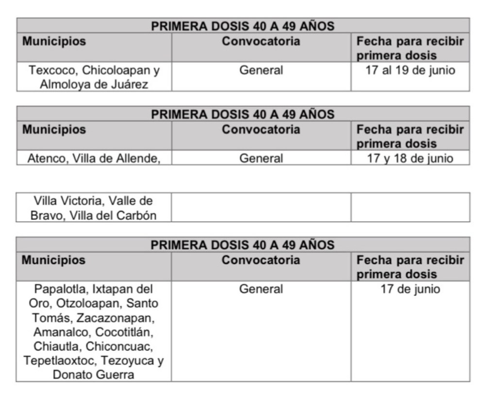 A partir del jueves 17 y hasta el sábado 19 de junio se aplicará la primera dosis de la vacuna contra COVID-19 a las personas de 40 a 49 años de edad y mujeres embarazadas en 20 municipios del Estado de México.