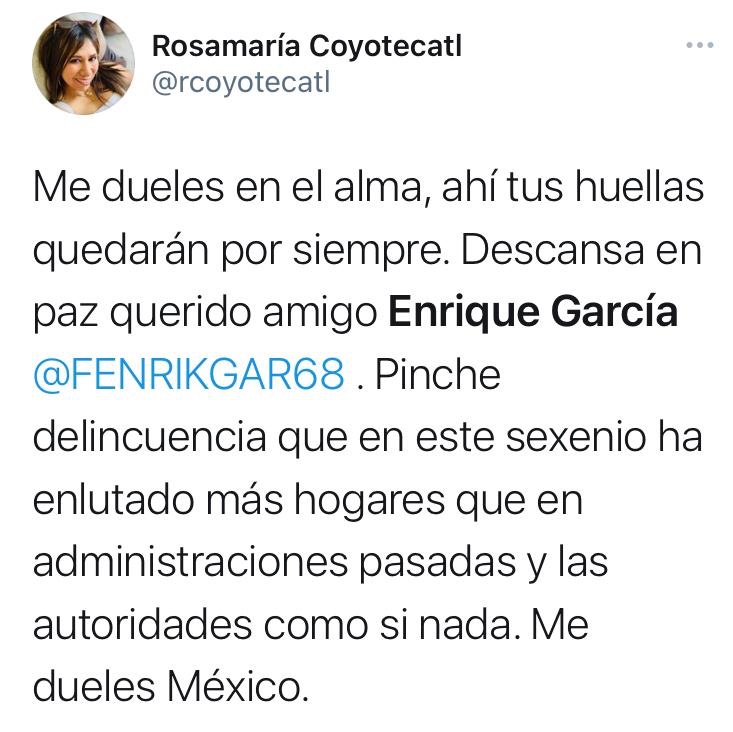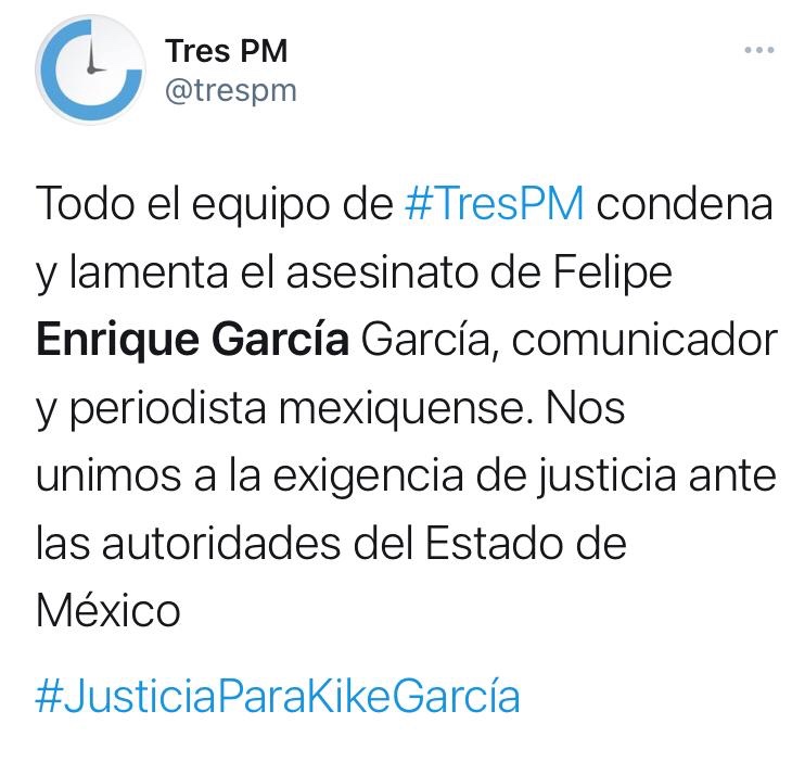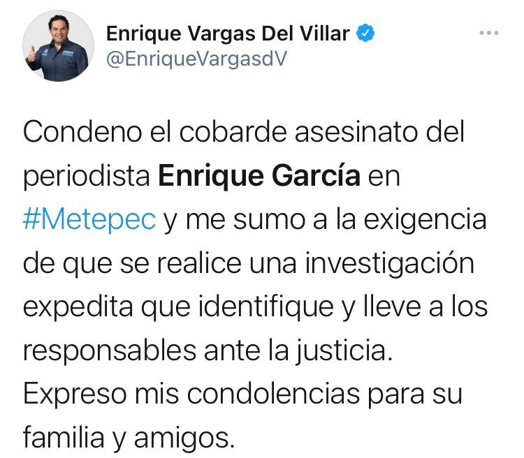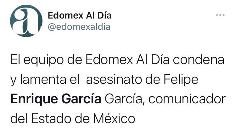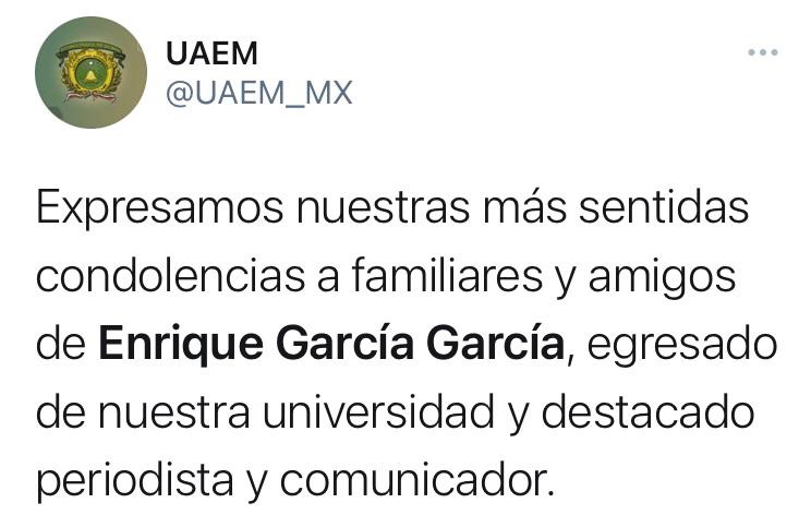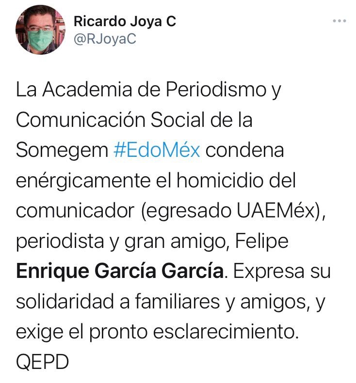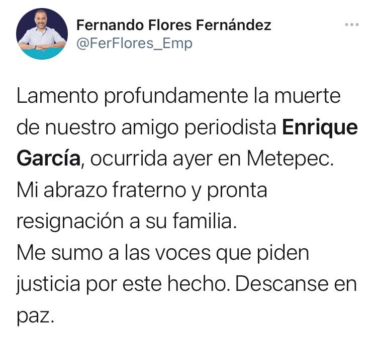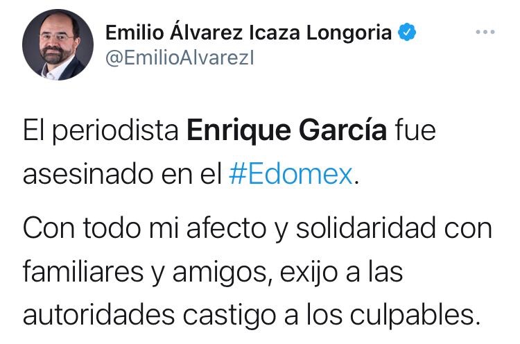 Periodistas, personas dedicadas a la administración pública y política del Estado de México, condenaron el cobarde homicidio del Comunicador Enrique García García, perpetrado en el municipio de Metepec, la madrugada de este jueves.