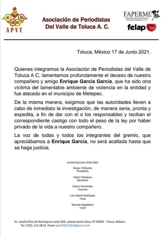 Cabe mencionar que a este enérgico y respetuoso llamado, nos sumamos las y los integrantes del equipo periodístico del periódico Portavoz, así como la Asociación de Periodistas del Valle de Toluca (APVT).