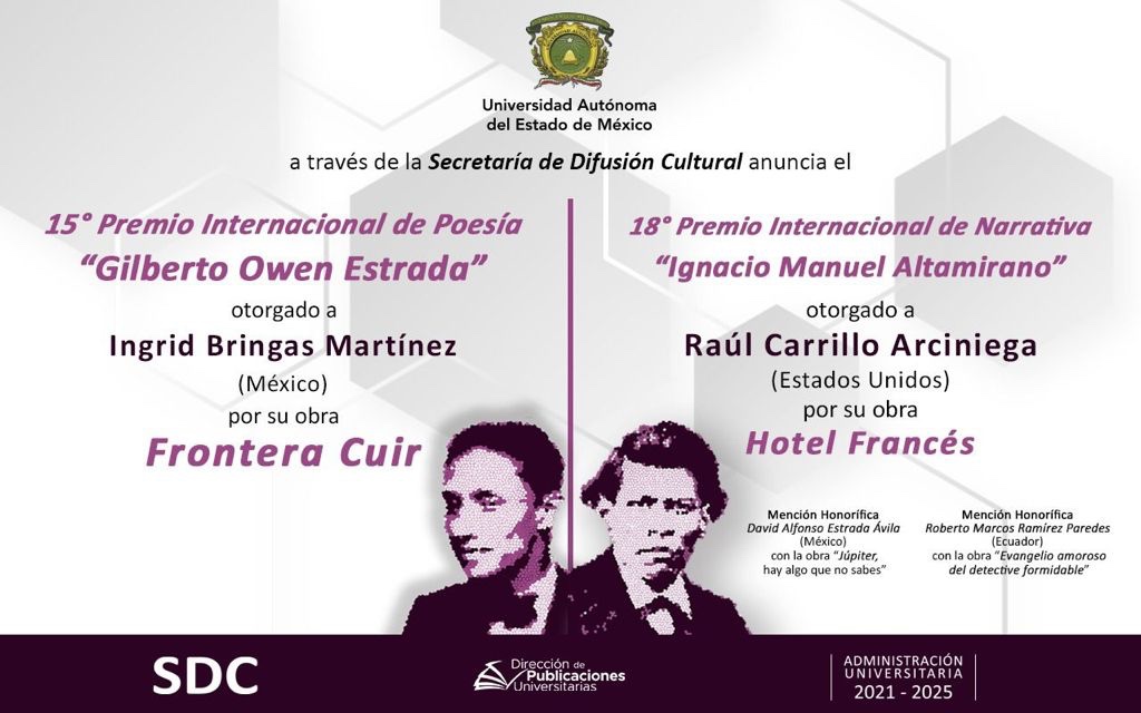 Toluca, Estado de México, 19 de junio de 2021.- Con Frontera Cuir, la poeta mexicana Ingrid Bringas Martínez ganó el 15º Premio Internacional de Poesía “Gilberto Owen Estrada” y, con la novela Hotel francés, el escritor Raúl Carrillo Arciniega obtuvo el 18º Premio Internacional de Narrativa “Ignacio Manuel Altamirano” de la Universidad Autónoma del Estado de México (UAEM), que convocó en ambos certámenes de literatura la participación de casi mil 100 trabajos de escritores de más de 30 países.