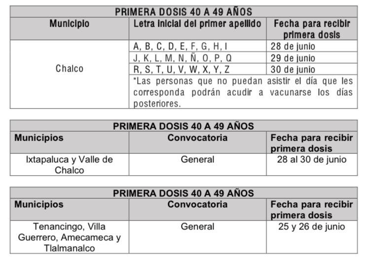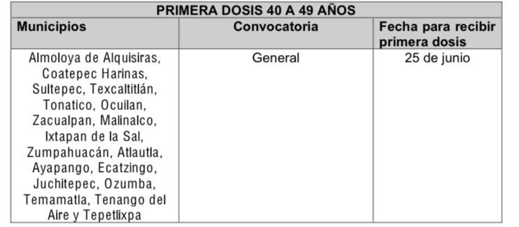 Los gobiernos de México y del Estado de México informaron que se iniciará la vacunación para las personas de 40 a 49 años y mujeres embarazadas mayores de edad, con más de nueve semanas de gestación, de los municipios de: