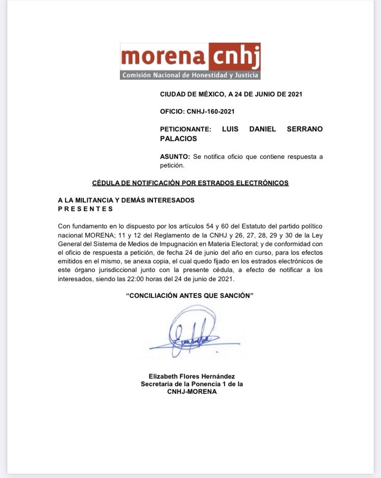 La respuesta de este oficio, se da a raíz de un escrito promovido por Daniel Serrano en el que solicita a la CNHJ se informe si hay alguna resolución en la que se cancelen sus derechos en el partido, por lo que la comisión en mención emitió esta aclaración.