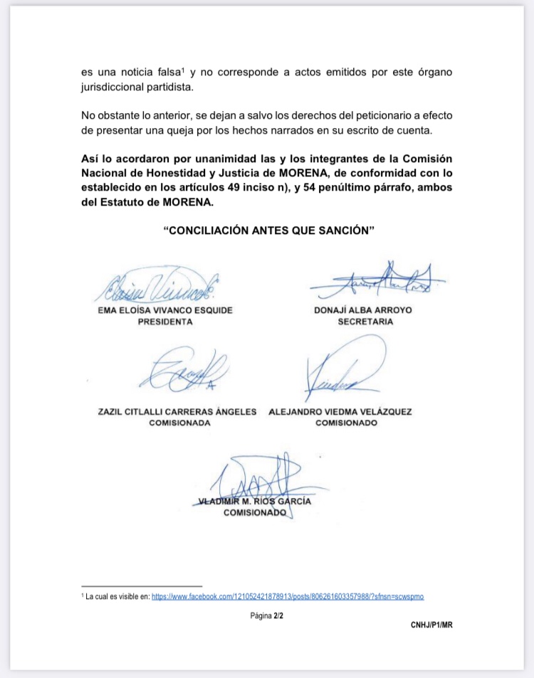 Con información del oficio número CNHJ-160-2021, la CNHJ de Morena informó que “hasta la emisión del presente asunto, esta Comisión no ha dictado resolución mediante la cual se cancelen sus derechos partidistas”, por lo que la información que dolosamente se hizo circular en redes sociales es falsa.