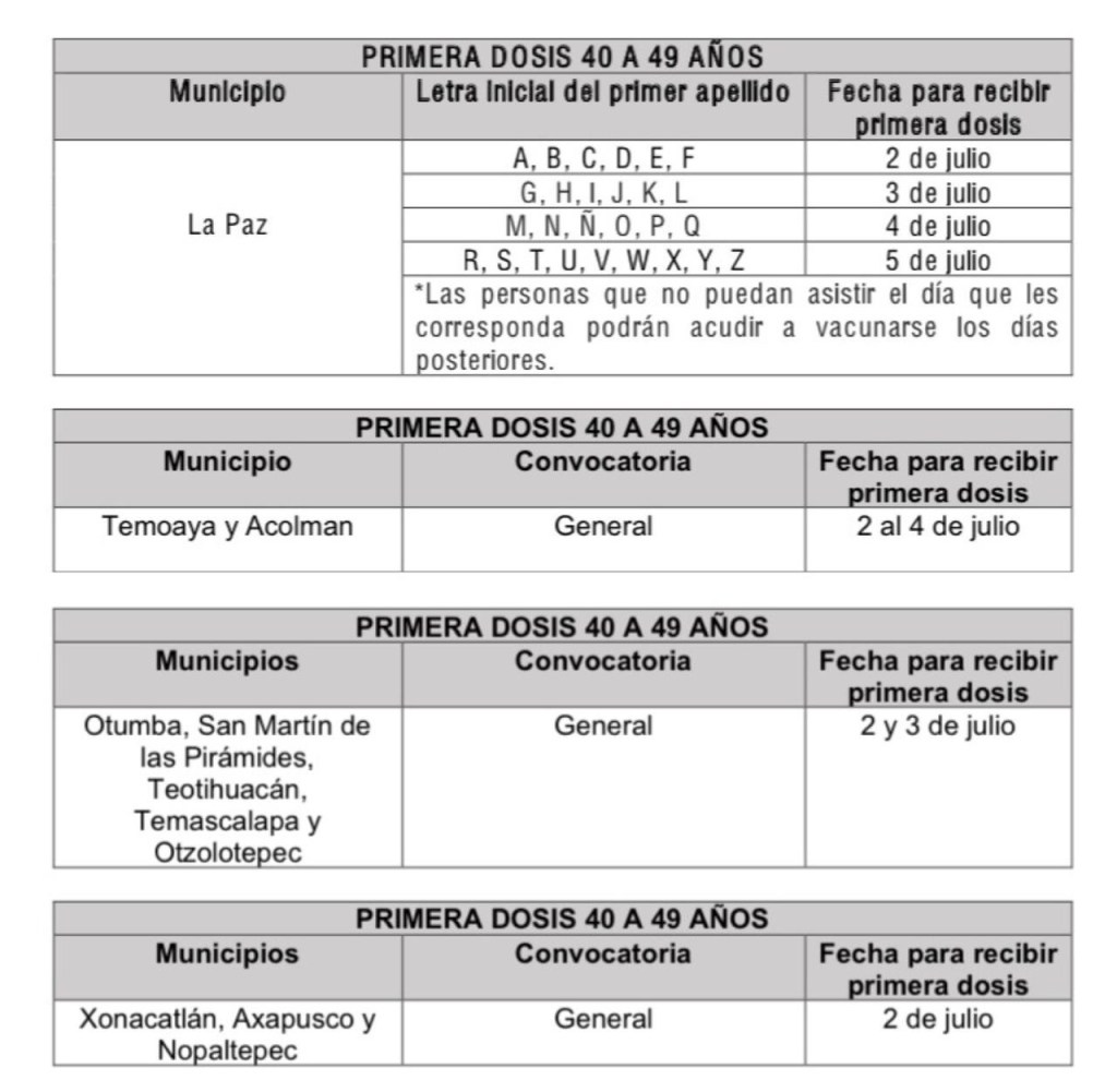 En coordinación con los ayuntamientos mexiquenses, el próximo viernes 2 de julio inicia la aplicación de la primera dosis del biológico contra COVID-19 a personas de 40 a 49 años y mujeres embarazadas mayores de edad con más de nueve semanas de gestación en los municipios de: