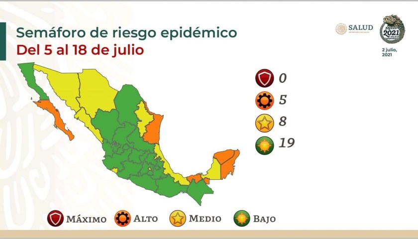 - Del 5 al 18 de julio, 19 entidades permanecerán en color verde del Semáforo de Riesgo Epidémico, mientras que 8 estarán en color amarillo y 5 en naranja.
