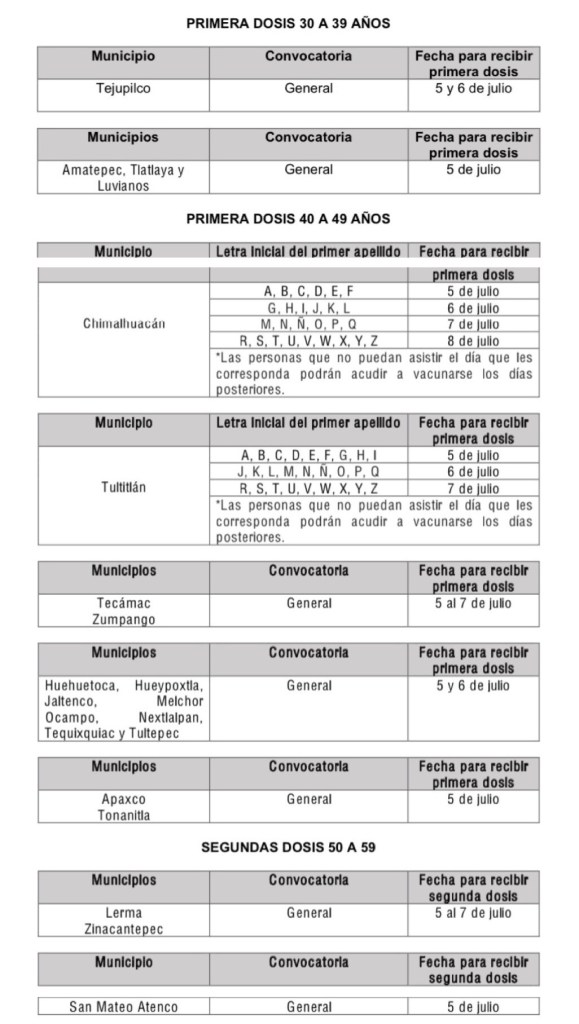 Además se aplicará la primera dosis de vacuna en las 13 demarcaciones faltantes del grupo etario de 40 a 49 años: Apaxco, Chimalhuacán, Huehuetoca, Hueypoxtla, Jaltenco, Melchor Ocampo, Nextlalpan, Tecámac, Tequixquiac, Tonanitla, Tultepec, Tultitlán y Zumpango.