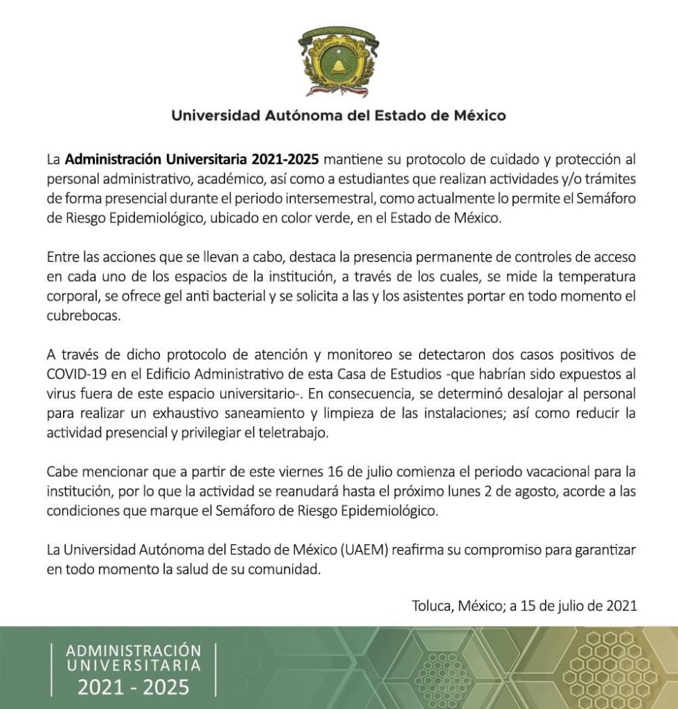 La Universidad Autónoma del Estado de México reportó dos casos positivos a Covid-19, del personal que labora en Edificio Administrativo.