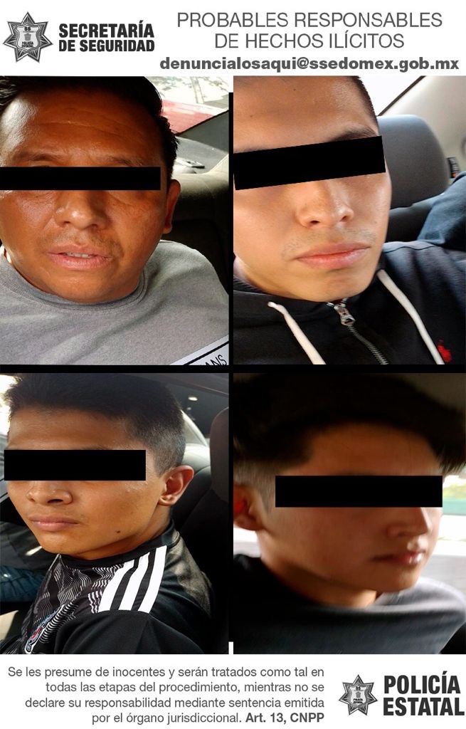 Luego de confirmar con el C5 el estatus legal del automotor, los policías estatales detuvieron a Eric “N”, Martín “N”, Jesús “N” y Víctor “N”, de 19, 25, 18 y 45 años de edad, respectivamente, este último cuenta con antecedentes penales por el ilícito de alteración al orden público en el municipio de Naucalpan.