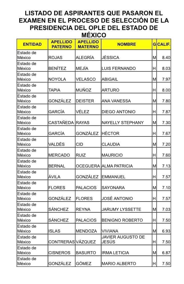 Diez hombres y diez mujeres son lis que pasan a la siguiente etapa para obtener el nombramiento de presidente o presidenta del Instituto Electoral del Estado de México (IEEM), de acuerdo con trascendidos publicados en redes sociales.