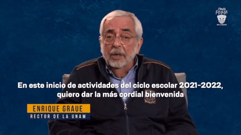 El rector de la UNAM, Enrique Graue Wiechers, dio un mensaje de bienvenida al inicio de las actividades del ciclo escolar 2021-2022 e invitó a los alumnos a registrarse y acudir a la aplicación de la vacuna contra el Covid-19, en el sitio designado en su alcaldía o municipio.