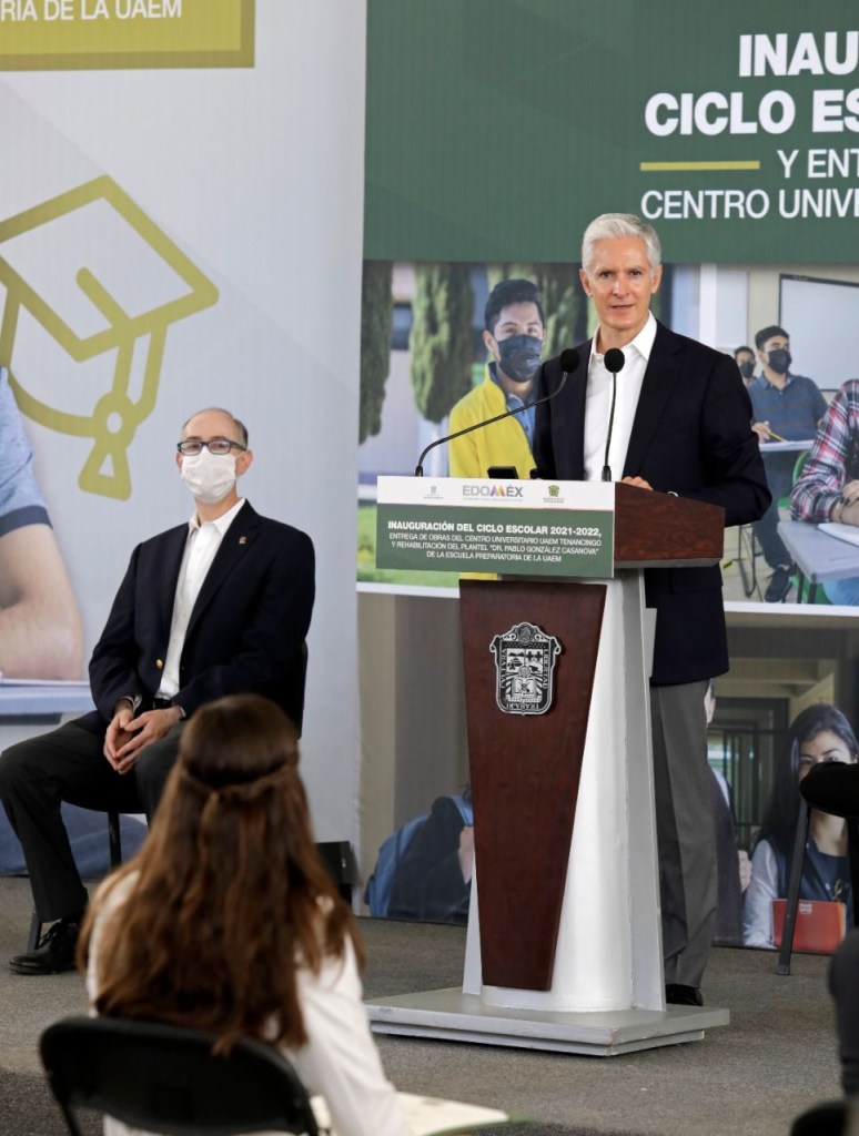En el Plantel «Dr. Pablo González Casanova» de la Escuela Preparatoria de la UAEM, el Gobernador del Edoméx subrayó las acciones que implementa la máxima casa de estudios del estado para salvaguardar la salud de su comunidad, entre ellas la vacunación de la mayoría del personal académico y docente; asistencia presencial voluntaria; las aulas, las prácticas, así como las actividades de investigación, deportivas y culturales, se llevarán a cabo de manera escalonada, con un aforo máximo del 50 por ciento, y el acceso a los espacios universitarios es permitido solamente a aquellas personas que cumplan con el protocolo sanitario.