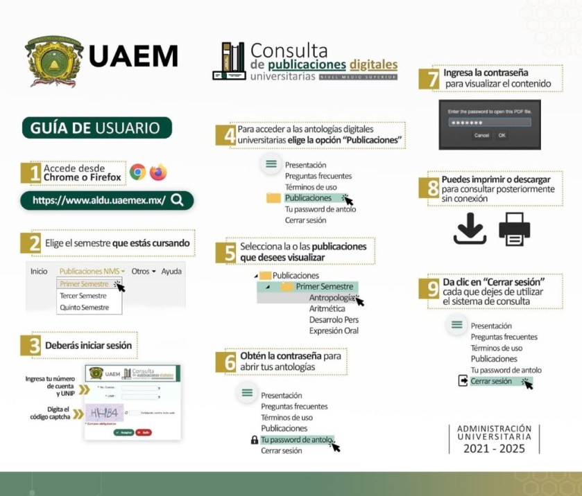 Para este ciclo escolar 2021-2022, los más de 23 mil estudiantes de bachillerato que cursan en alguno de los 10 planteles de la Escuela Preparatoria de la Universidad Autónoma del Estado de México (UAEM) podrán adquirir en formato digital los libros de texto en el espacio virtual Consulta de Publicaciones Digitales Universitarias (ALDU) disponibles en la dirección: https://www.aldu.uaemex.mx.