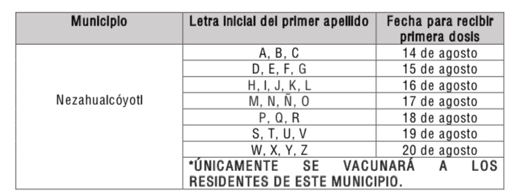 El próximo sábado 14 de agosto dará inicio la jornada de vacunación para la primera dosis contra COVID-19 a las personas de 18 a 29 años en Nezahualcóyotl, en un horario de 9:00 a 17:00 horas, con base en el siguiente calendario: