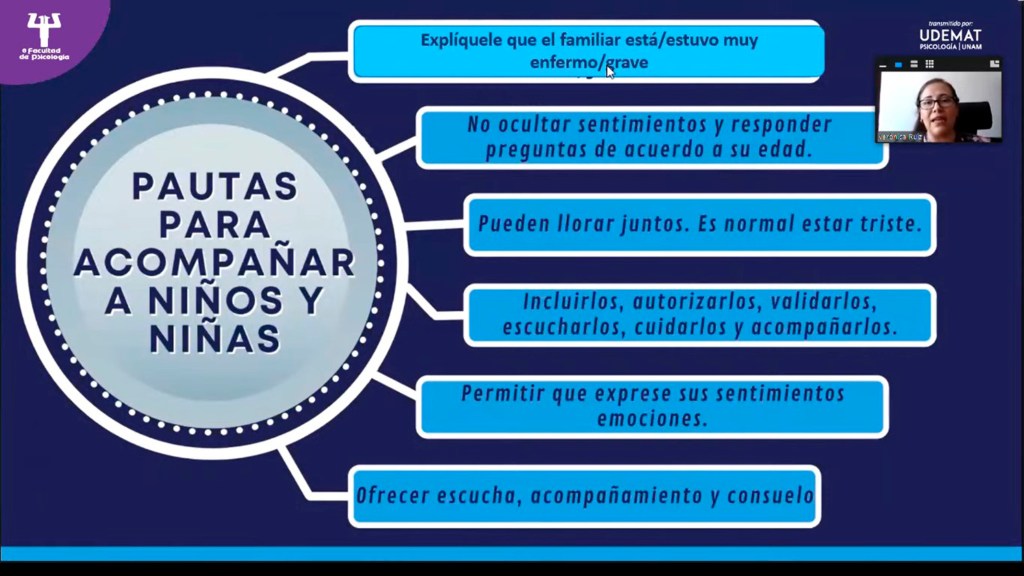 Indicó que deben realizar las tareas del proceso de duelo; es decir, reconocer la realidad de la pérdida, tanto a nivel emocional como racional; elaborar las emociones relacionadas con la pérdida (tristeza, miedo, dolor, enfado, ansiedad, vergüenza o culpa), predominan las negativas, por lo que es importante generar espacios y encuentros donde niñas, niños y adolescentes sean escuchados, consolados y reconfortados.