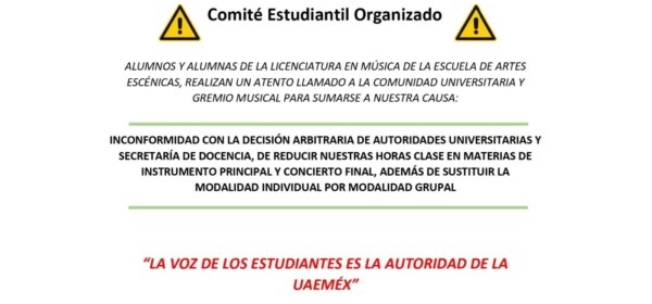 Alumnos, alumnas y catedráticos ¡exigen clases de instrumento individual completa! Grave descontento de alumnas y alumnos que conforman el Comité Estudiantil Organizado. Ante la decisión