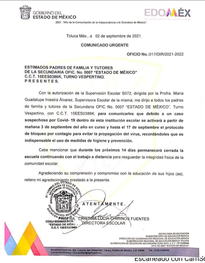 De acuerdo con un documento oficial, suscrito por las autoridades escolares, el plantel permanecerá cerrado del 3 al 17 de septiembre, es decir, 14 días, pero al parecer solamente para el turno vespertino. Se dice que el turno matutino seguirá operando de manera presencial, situación que provoca incertidumbre en padres de familia, ya las instalaciones son las mismas para ambos turnos.