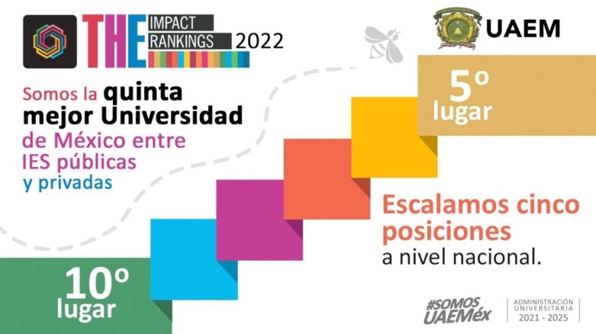 Toluca, Estado de México, 08 de septiembre de 2021.- La Universidad Autónoma del Estado de México (UAEM) es la quinta mejor institución de educación superior del país, entre públicas y privadas, de acuerdo con el Ranking Mundial de Universidades 2022 de Times Higher Education (THE), en el que con respecto al año anterior la institución mexiquense escaló cinco posiciones.