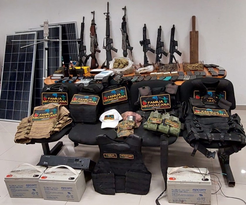 ·Gorras, chalecos, porta cargadores y una pechera con leyenda La Familia Michoacana
