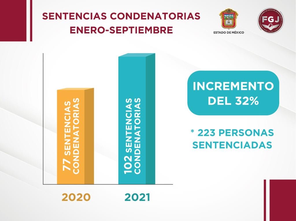 Además, ha habido un incremento en las sentencias condenatorias en un 32 por ciento. Detalló que son 102 las carpetas de investigación en las que se ha dictado una sentencia de condena, en contra de 223 personas.