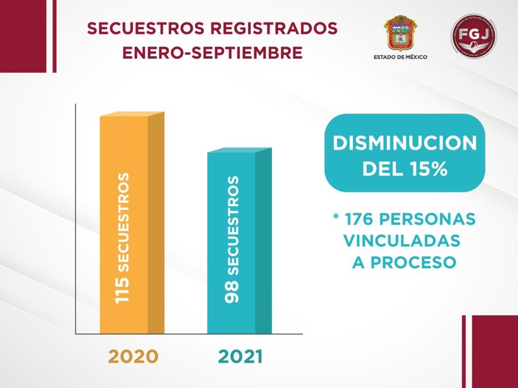 - Por lo que hace al delito de secuestro, en el Estado de México se registra una disminución de 15 por ciento, en los primeros nueve meses de este año, en comparación con el mismo periodo del año anterior.