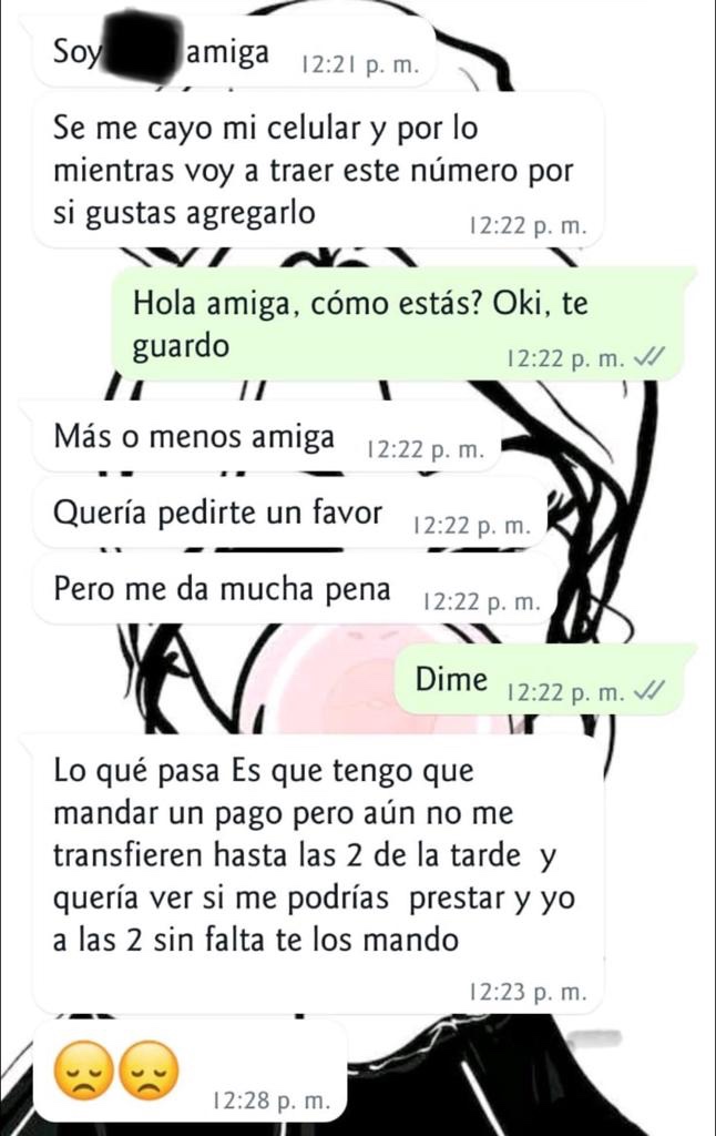 A través de saludos y mensajes muy familiares, los estafadores ganan la confianza de los contactos y explican que tienen algún tipo de problema económico y solicitan el apoyo del amigo, amiga o familiar.