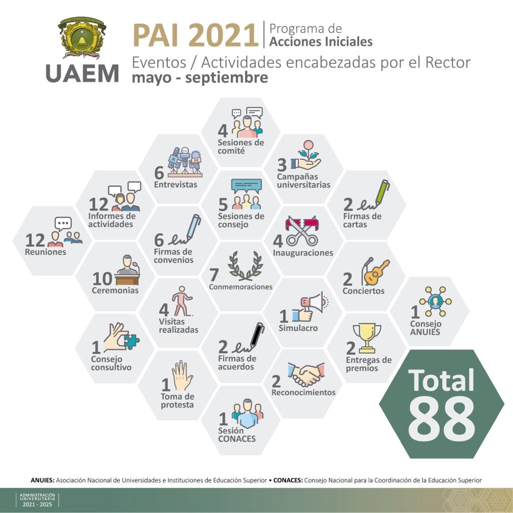En este marco, se firmaron 10 instrumentos de colaboración -convenios, acuerdos y cartas de intención-, se realizaron cinco sesiones del H. Consejo Universitario, dos ceremonias de entregas de premios, 12 informes de actividades –en los que se entregaron obras de rehabilitación en cada espacio académico-, cuatro inauguraciones y un simulacro, entre otras actividades.